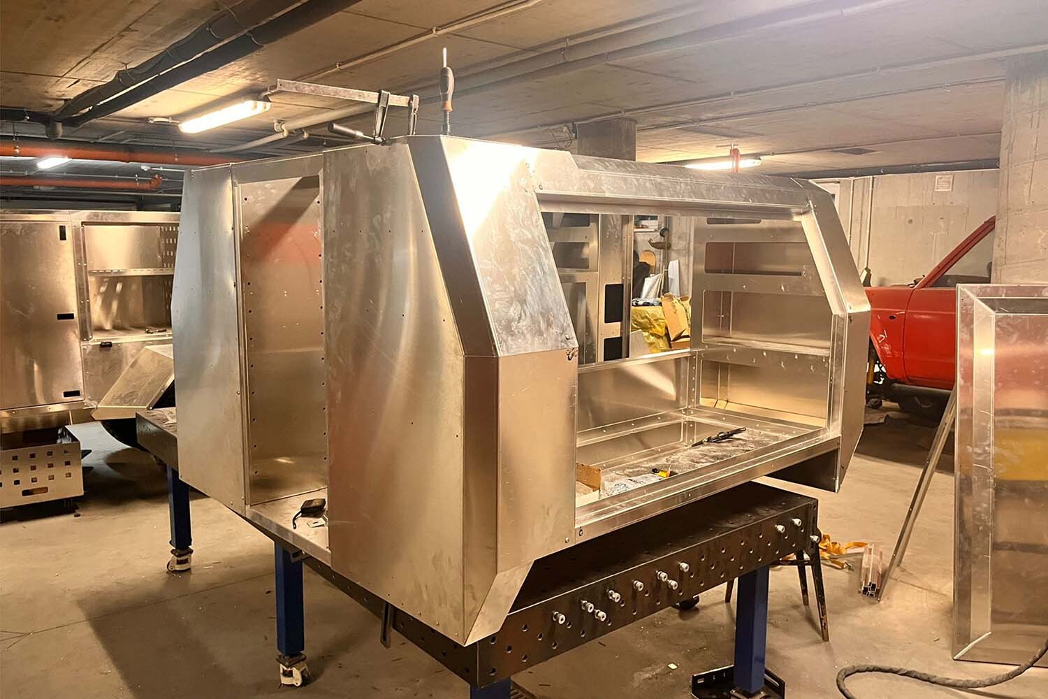 Cała zabudowa waży zaledwie 350 kg, a po odjęciu oryginalnej skrzyni – tylko 200 kg więcej niż seria. Taki wynik był możliwy dzięki wykorzystaniu samonośnej konstrukcji z aluminium, w której każdy element – od podłogi, przez szafki i dach, aż po półki –