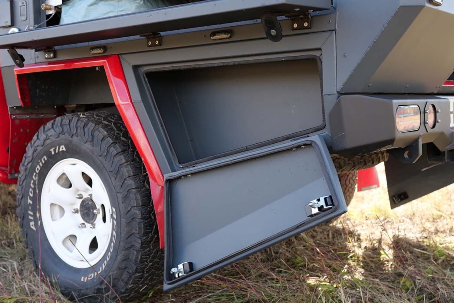 Po obu stronach zabudowy, w okolicach nadkoli, znajdują się szczelne schowki dostępne z zewnątrz. To idealne miejsce na przedmioty, które chcesz mieć zawsze pod ręką – liny, taśmy, narzędzia czy inne elementy niezbędne podczas off-roadowych wypraw. Dzięki nim nie musisz otwierać głównej części zabudowy, gdy potrzebujesz czegoś szybko i bez zbędnego zamieszania. Schowki są zamykane i wodoszczelne, więc zawartość pozostaje bezpieczna nawet w trudnych warunkach.
