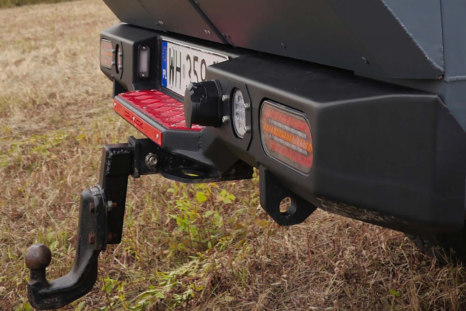 Tylny zderzak pełni nie tylko funkcję ochronną, ale także użytkową – zintegrowano w nim pełne oświetlenie pojazdu oraz solidne punkty montażowe, w tym kwadrat pod hak holowniczy w standardzie USA. Posiada także praktyczny stopień, który ułatwia wchodzenie do wnętrza zabudowy. Co więcej, jego narożniki zostały wyprofilowane w sposób chroniący boczne schowki przed uszkodzeniami przy manewrach w terenie. To rozwiązanie łączy funkcjonalność z trwałością.